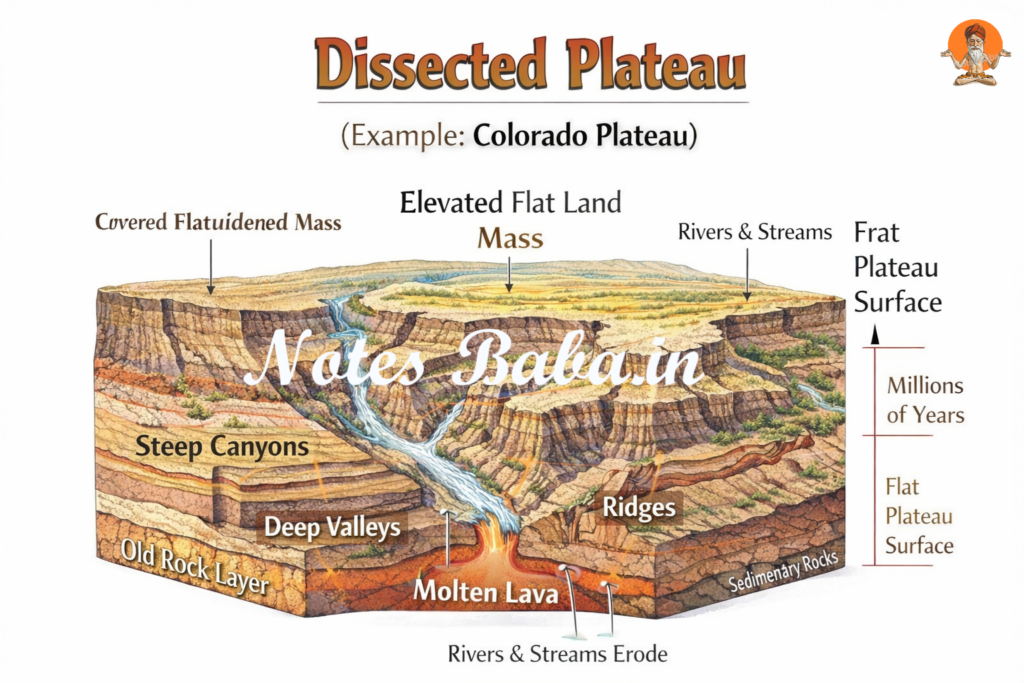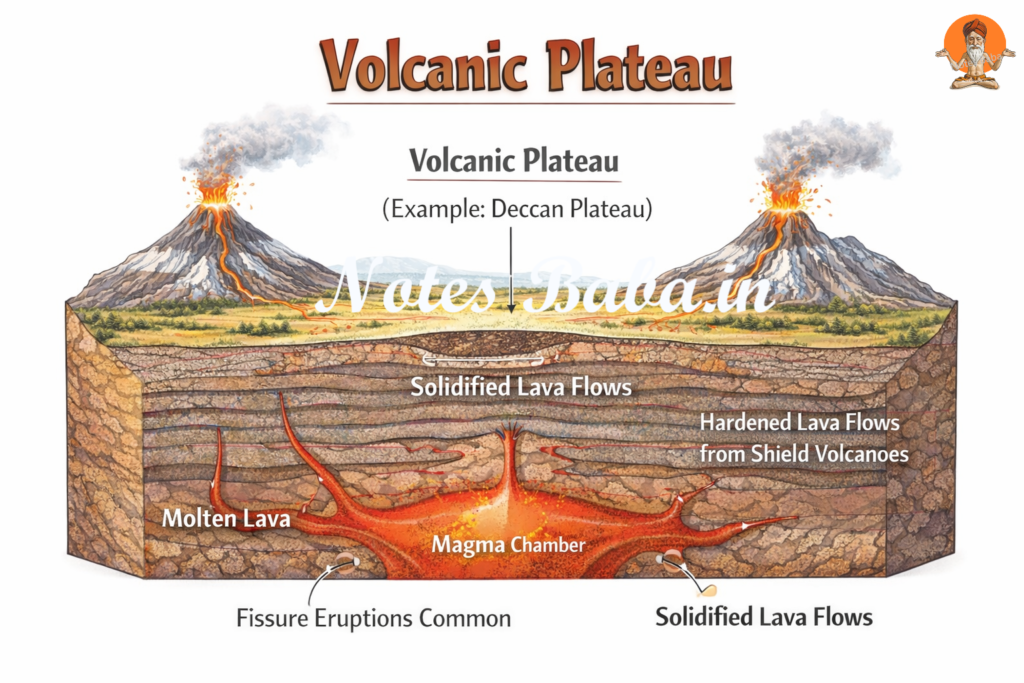 • As successive layers of lava solidify, they create a flat or gently sloping elevated area known as a plateau.