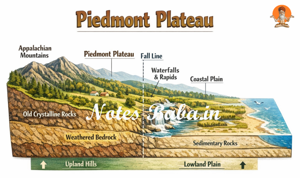 • The word ‘Piedmont‘ means ‘foot of a mountain‘. It is a type of plateau which is located at the foot of a mountain.